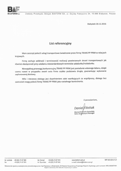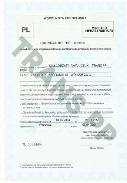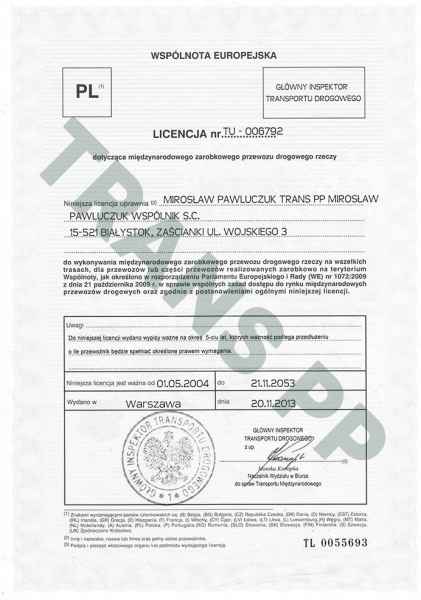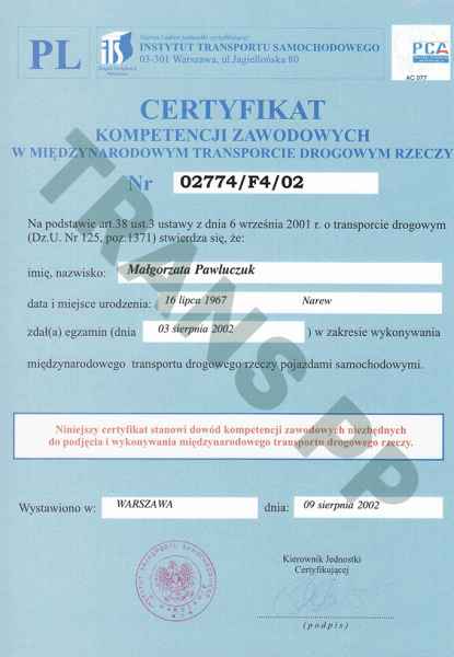 Posiadamy ubezpieczenie OCP w ruchu krajowym i międzynarodowym; certyfikat kompetencji zawodowej jak również licencje w transporcie krajowym i międzynarodowym, licencję spedycji.